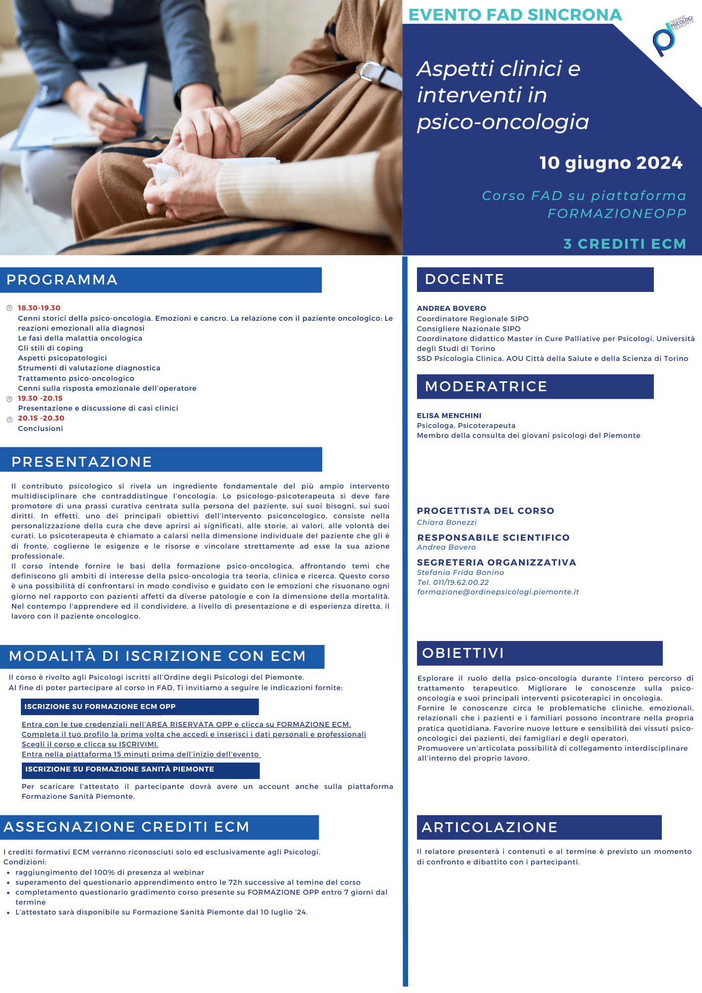 continua l’offerta formativa ECM in forma gratuita proposta dall’OPP alle Colleghe e ai Colleghi iscritti all’Albo, con l’evento dal titolo “Aspetti clinici e interventi in Psiconcologia”, organizzato in collaborazione con la Consulta delle Giovani Psicologhe e dei Giovani Psicologi.