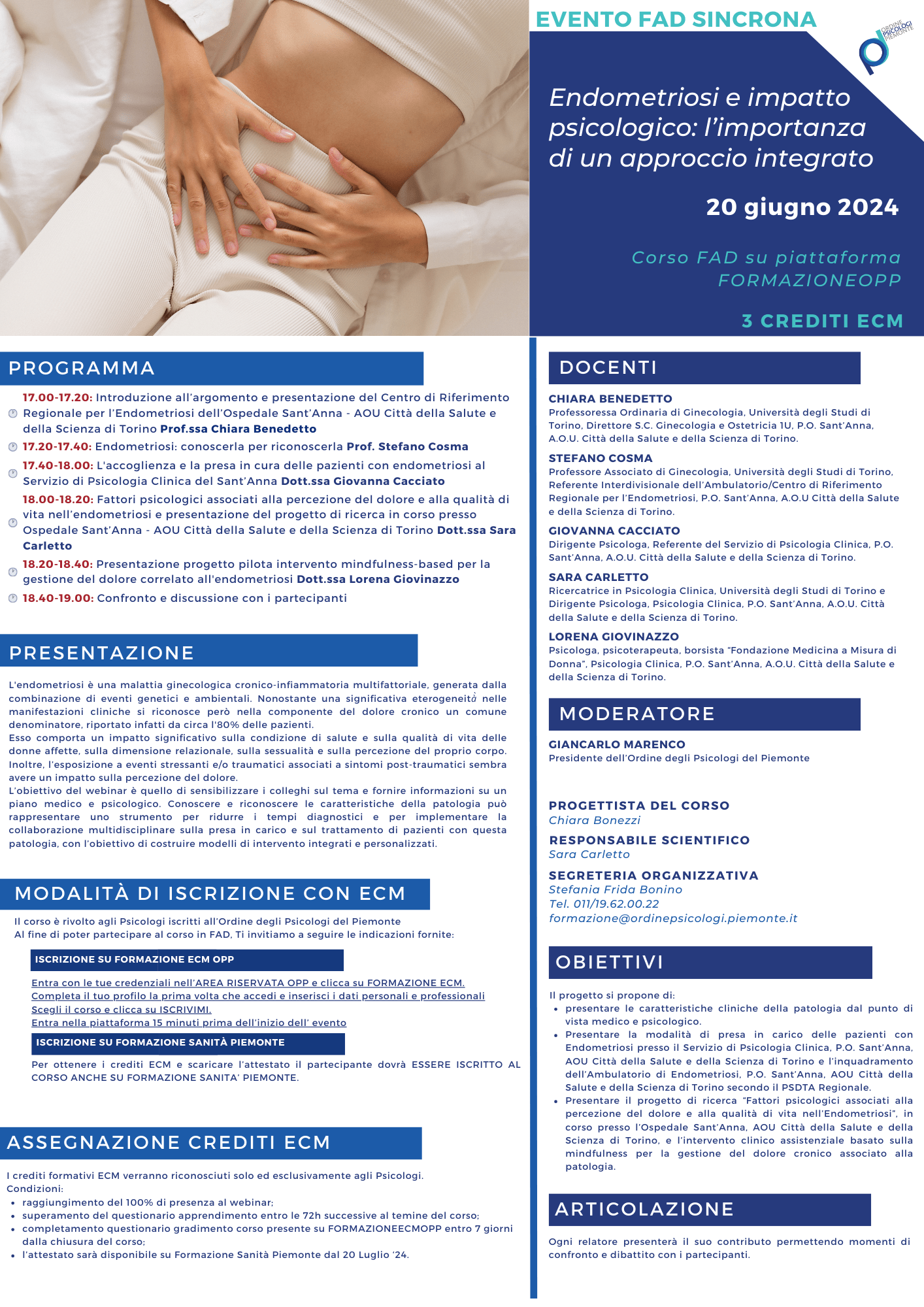 continua l’offerta formativa specifica e in forma gratuita dell’Ordine degli Psicologi del Piemonte, finalizzata a garantire alle Colleghe e ai Colleghi iscritti all’Albo l’assolvimento degli obblighi formativi, con crediti ECM, previsti per legge.