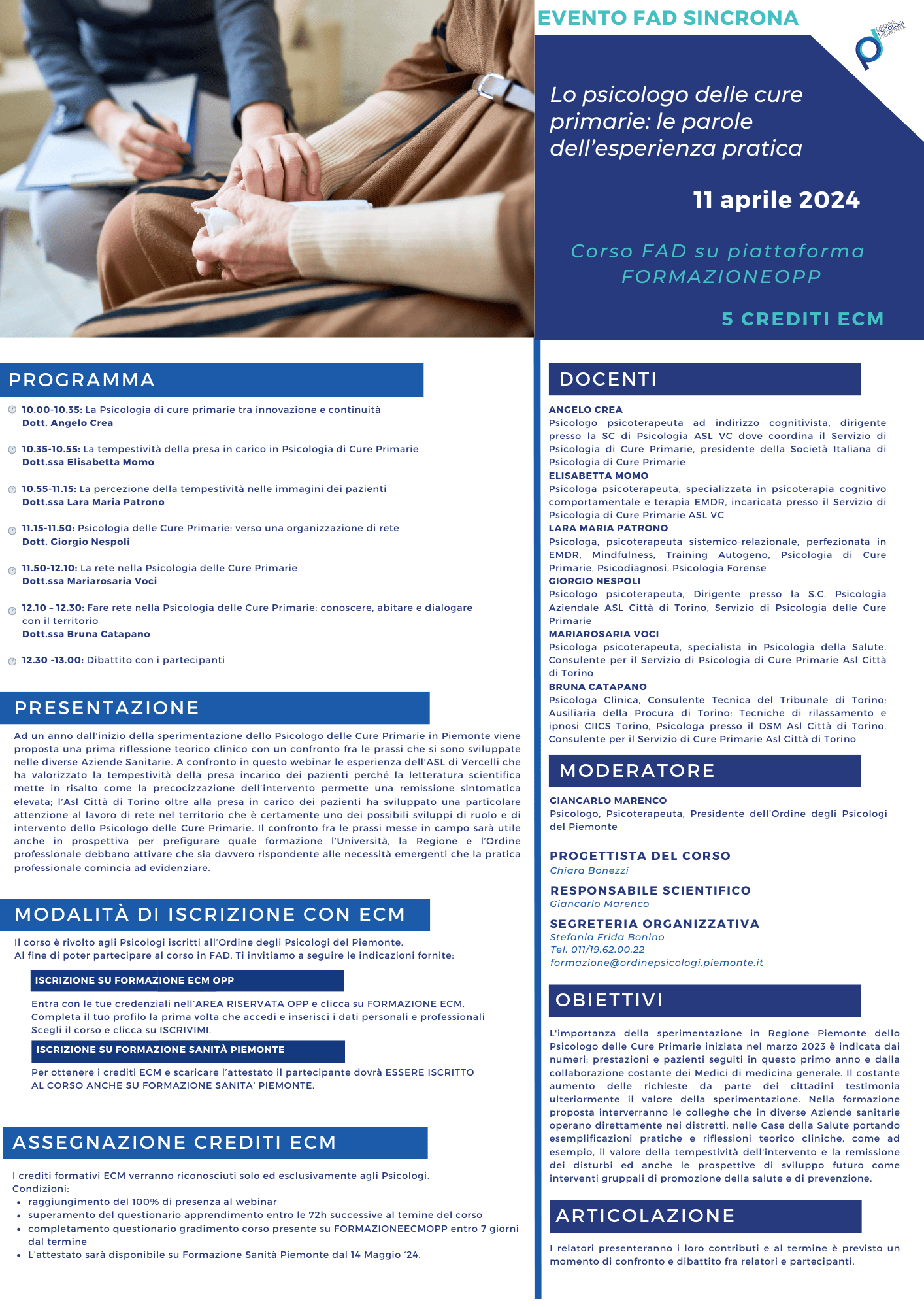 anche nel 2024 l’Ordine degli Psicologi del Piemonte intende garantire alle Colleghe e ai Colleghi iscritti all’Albo la formazione con crediti ECM, mediante un’offerta formativa specifica, in forma gratuita, attraverso la quale sarà possibile assolvere pienamente gli obblighi formativi previsti per legge.