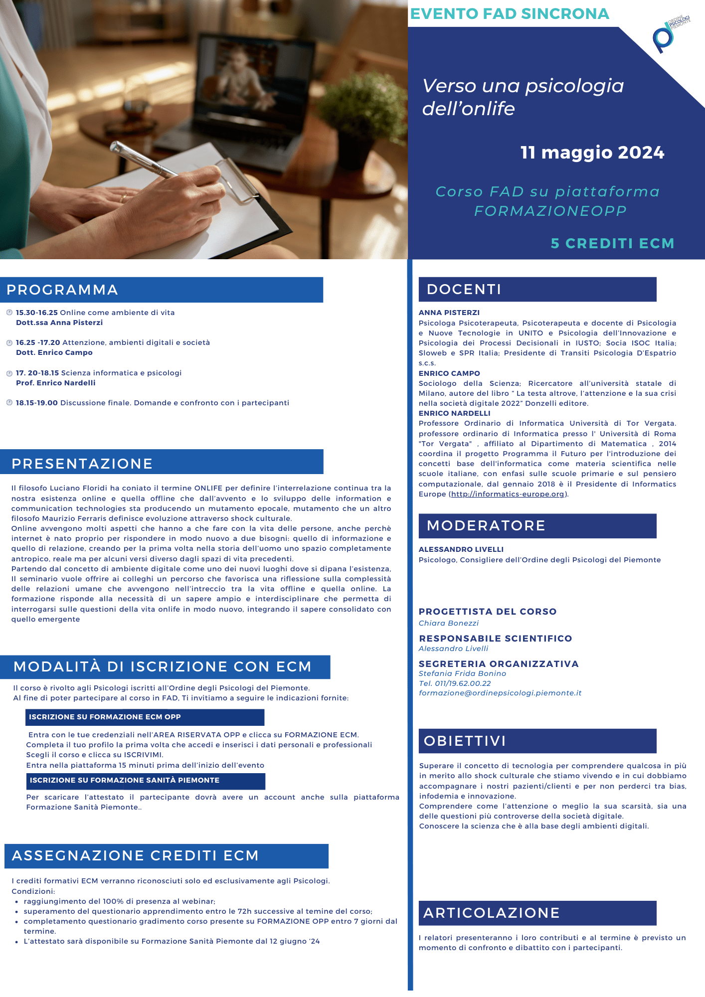 anche nel 2024 l’Ordine degli Psicologi del Piemonte intende garantire alle Colleghe e ai Colleghi iscritti all’Albo la formazione con crediti ECM, mediante un’offerta formativa specifica, in forma gratuita, attraverso la quale sarà possibile assolvere pienamente gli obblighi formativi previsti per legge.