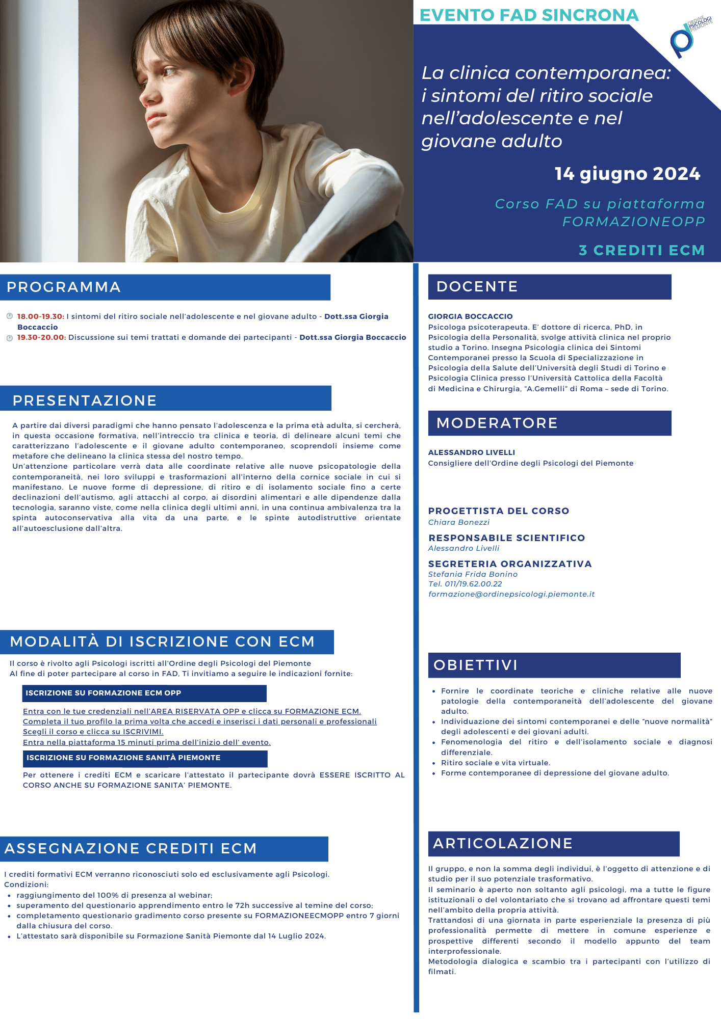 {Evento FAD accreditato ECM} “La clinica contemporanea: i sintomi del ritiro sociale nell’adolescente e nel giovane adulto” – 3 crediti formativi – 14 giugno