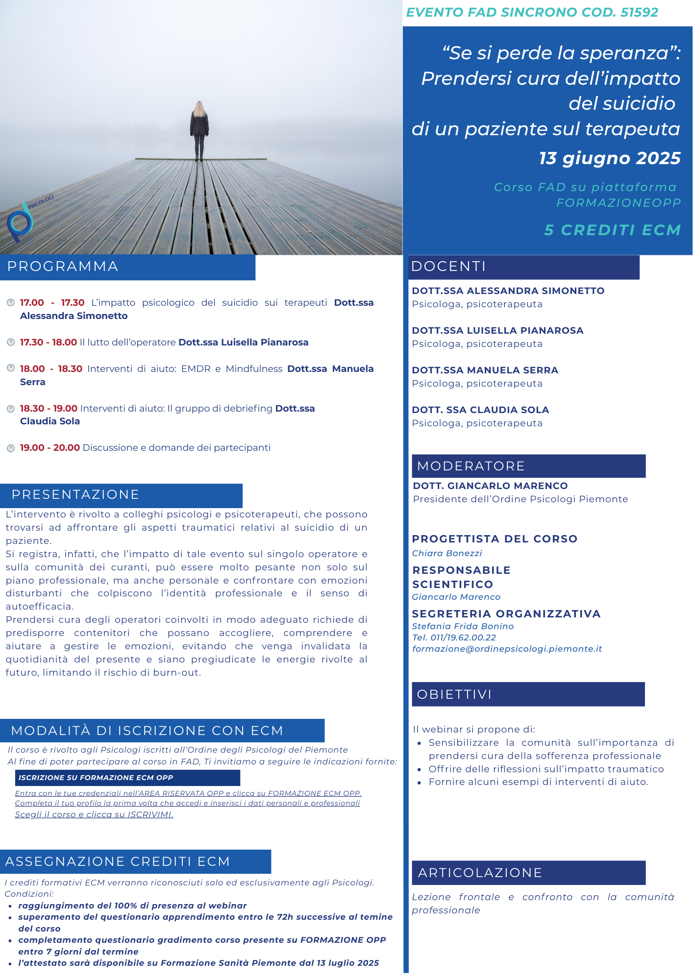 nell’ambito dell’offerta formativa ECM in forma gratuita 2025 l’OPP propone l’evento dal titolo “Se si perde la speranza: Prendersi cura dell’impatto del suicidio di un paziente sul terapeuta”.