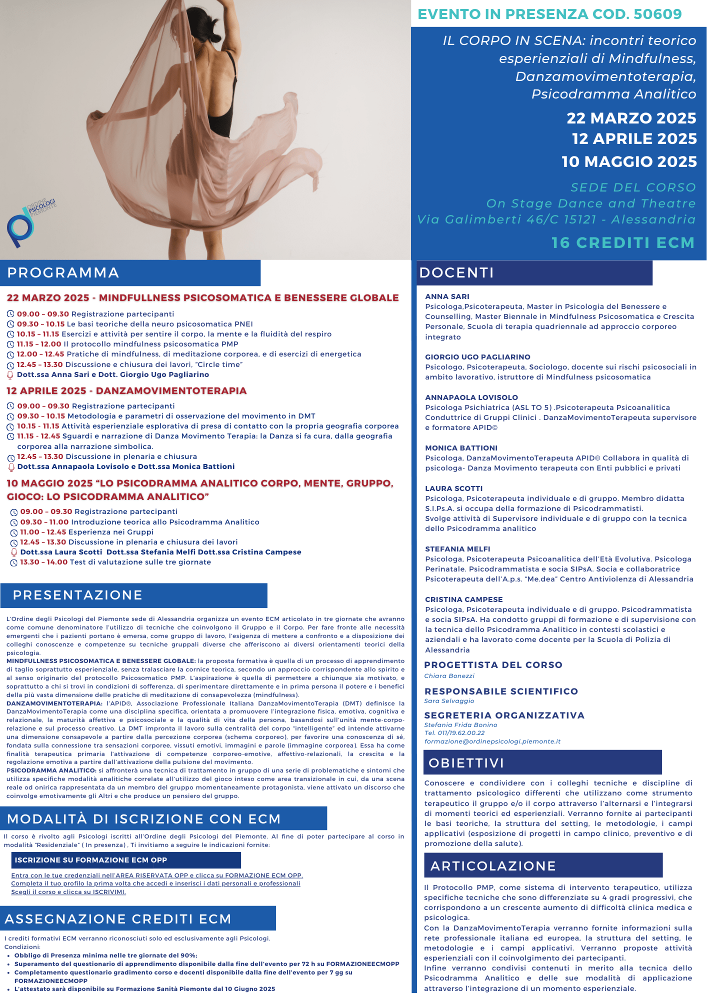 Il corso, suddiviso in 3 giornate, si terrà il 22 marzo 2025, dalle 9.30 alle 13.30 (MINDFULLNESS PSICOSOMATICA E BENESSERE GLOBALE), il 12 aprile 2025, dalle ore 9.30 alle ore 13.30 (DANZAMOVIMENTOTERAPIA) e il 10 maggio 2025, dalle ore 9.30 alle ore 14.00 (LO PSICODRAMMA ANALITICO: CORPO, MENTE, GRUPPO, GIOCO) presso l’ASD on Stage Dance Theatre, in Via Galimberti, 46C ad Alessandria.