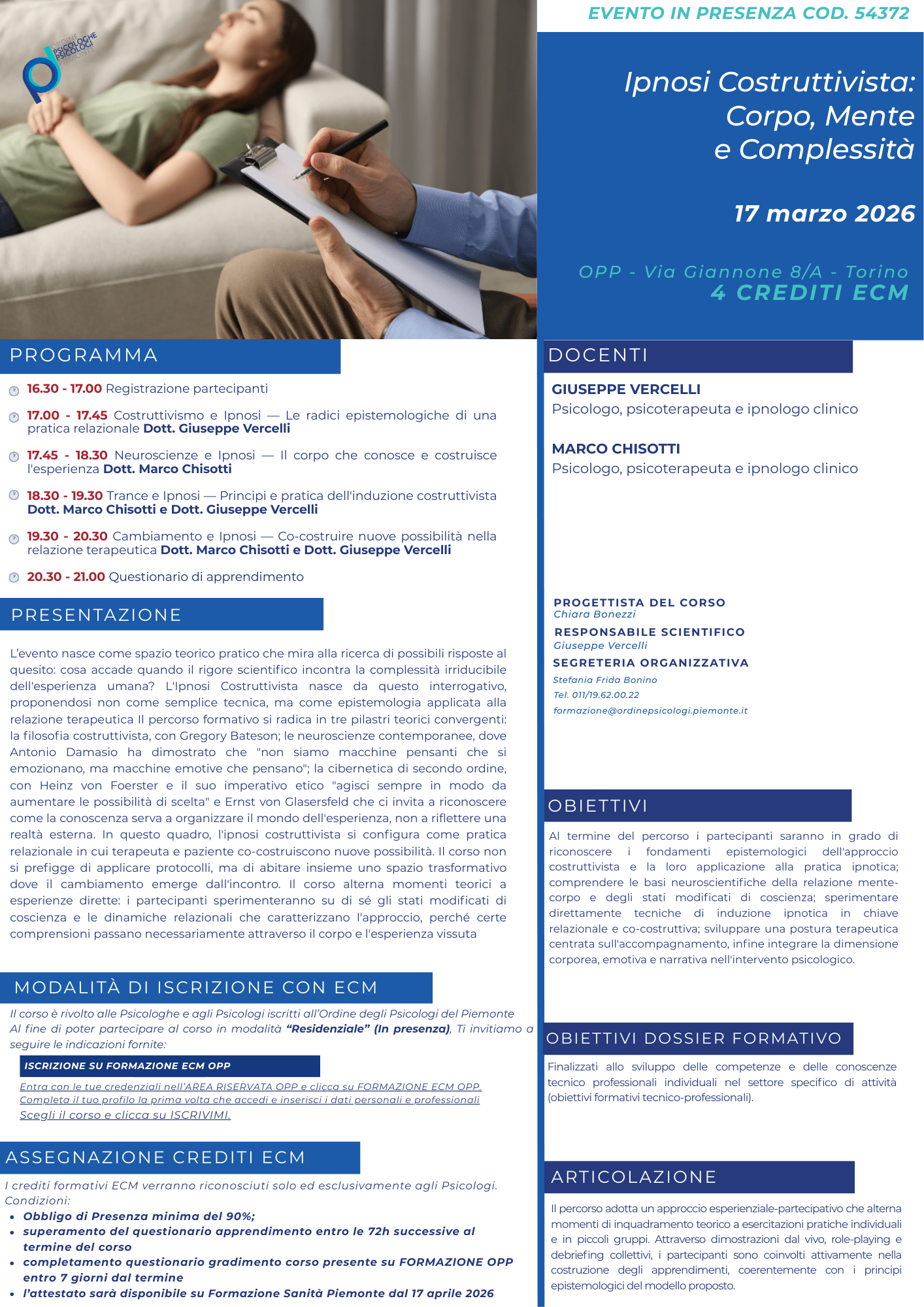 nell’ambito dell’offerta formativa ECM in forma gratuita 2026 l’OPP propone l’evento dal titolo “Ipnosi Costruttivista Corpo, Mente e Complessità”.