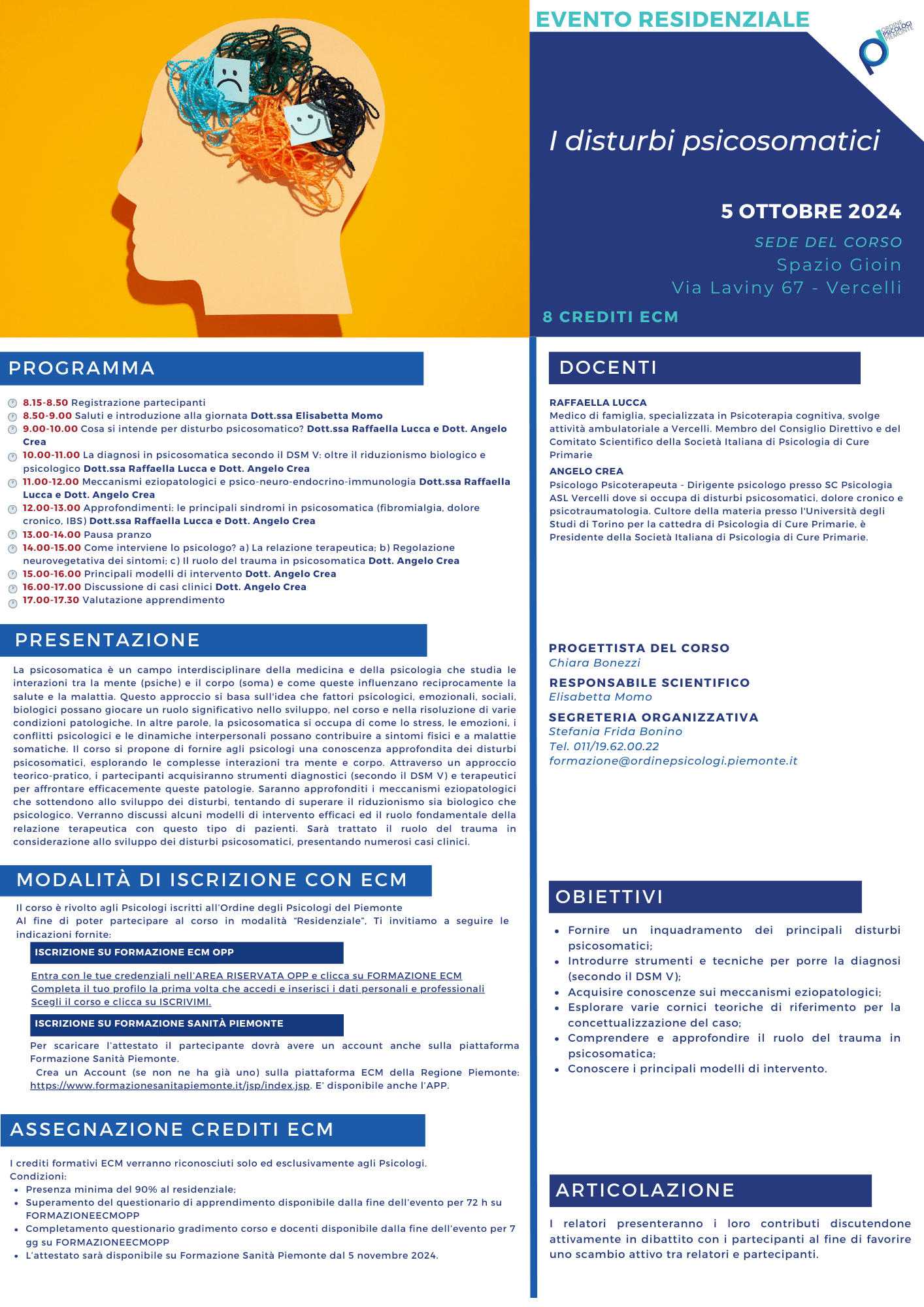 L’evento formativo mira a fornire una conoscenza approfondita dei disturbi psicosomatici, esplorando le complesse interazioni tra mente e corpo. Attraverso un approccio teorico-pratico, i partecipanti acquisiranno strumenti diagnostici (secondo il DSM V) e terapeutici per affrontare efficacemente queste patologie. Saranno approfonditi i meccanismi eziopatologici che sottendono allo sviluppo dei disturbi, tentando di superare il riduzionismo sia biologico che psicologico. Verranno discussi alcuni modelli di intervento efficaci ed il ruolo fondamentale della relazione terapeutica con questo tipo di pazienti. Sarà trattato il ruolo del trauma in considerazione allo sviluppo dei disturbi psicosomatici, presentando numerosi casi clinici.