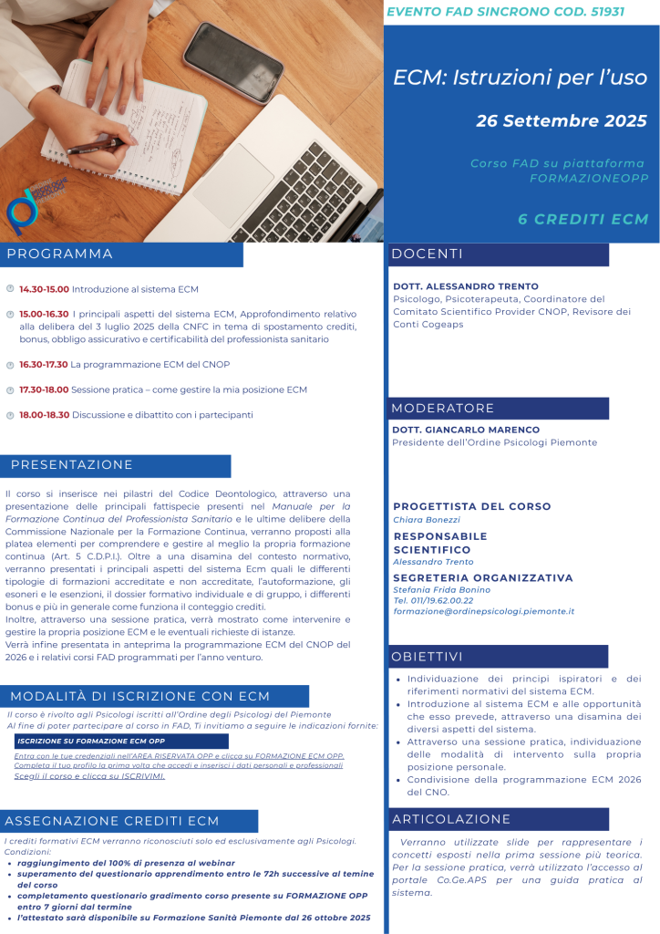 Obiettivo della formazione proposta: individuazione dei principi ispiratori e dei riferimenti normativi del sistema ECM; introduzione al sistema ECM e alle opportunità che esso prevede, attraverso una disamina dei diversi aspetti del sistema, condivisione della programmazione ECM 2026 del CNOP.
