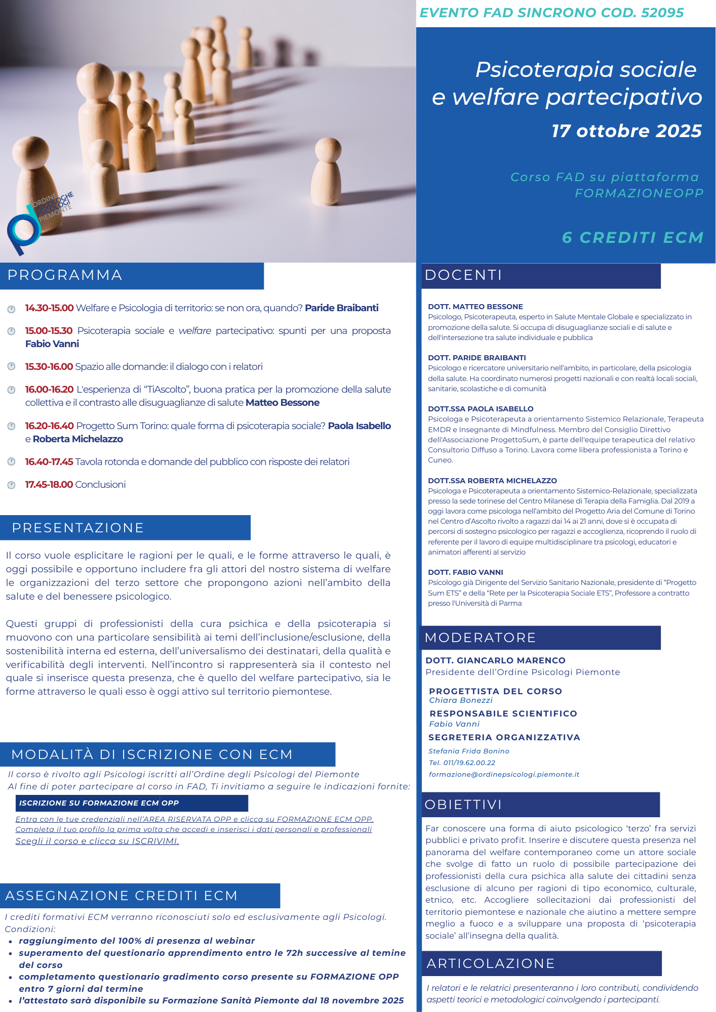 Nell’ambito dell’offerta formativa ECM in forma gratuita 2025 l’OPP propone l’evento dal titolo “Psicoterapia sociale e welfare partecipativo”.