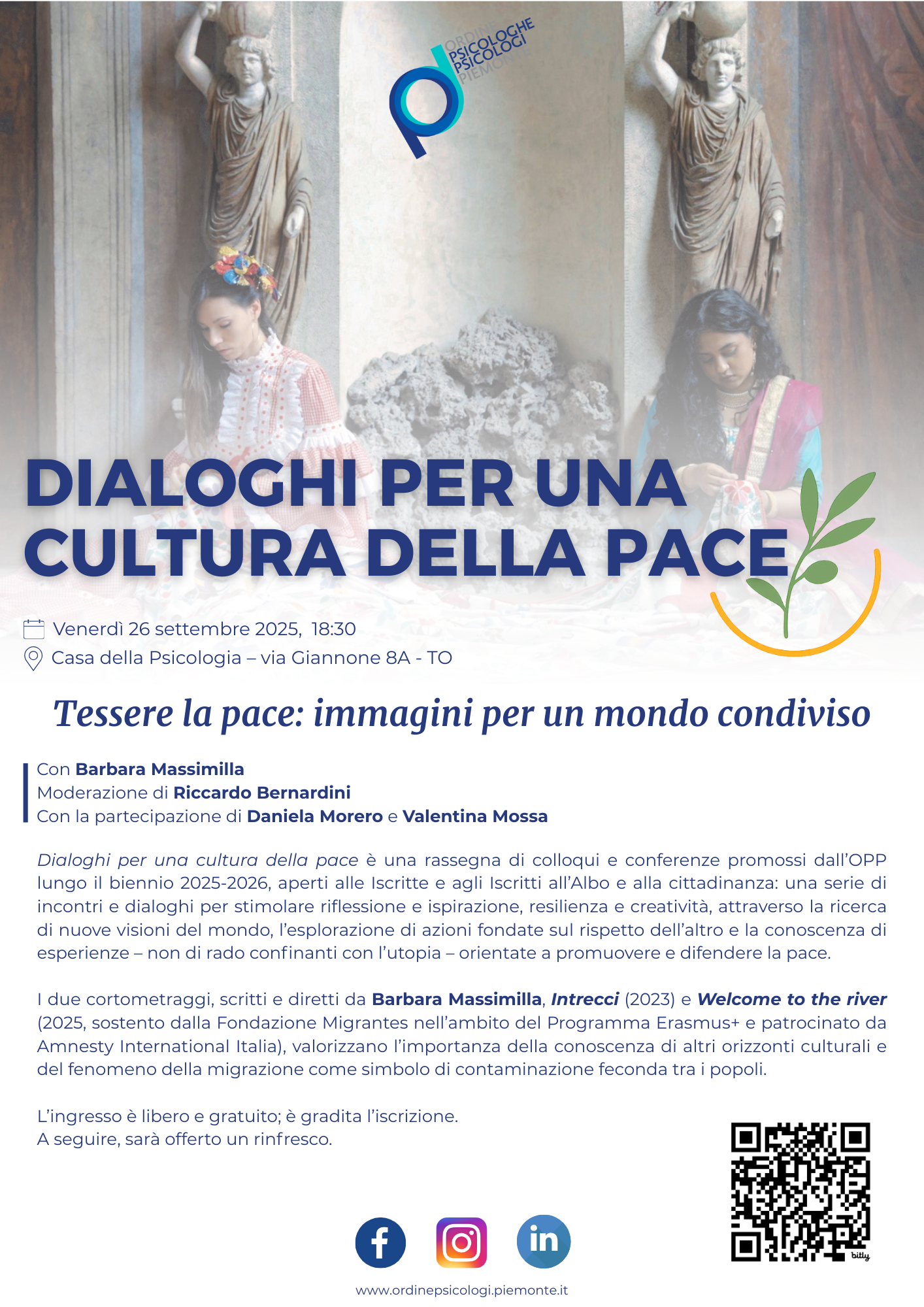 Serata culturale sul tema Tessere la pace: immagini per un mondo condiviso, Venerdì 26 settembre 2025, alle ore 18:30, presso la Casa della Psicologia, in via Giannone 8A, a Torino. Si tratta del primo appuntamento nell’ambito dei Dialoghi per una cultural della pace – una rassegna di colloqui e conferenze promossi dall’OPP lungo il biennio 2025-2026, aperti sia alle Iscritte e agli Iscritti all’Albo sia alla cittadinanza; una serie di incontri e dialoghi pensati per stimolare riflessione e ispirazione, resilienza e creatività, attraverso la ricerca di nuove visioni del mondo, l’esplorazione di azioni fondate sul rispetto dell’altro e la conoscenza di esperienze – non di rado confinanti con l’utopia – orientate a promuovere e difendere la pace. I due cortometraggi presentati in questa occasione, scritti e diretti da Barbara Massimilla, Intrecci (2023) e Welcome to the river (2025), valorizzano l’importanza della conoscenza di altri orizzonti culturali e del fenomeno della migrazione come simbolo di contaminazione feconda tra i popoli. In questo particolare momento storico, riteniamo infatti che l’arte cinematografica possa trasmettere un messaggio determinante nel contrastare il razzismo, la violenza di genere, quella inflitta all’infanzia e quella agita nei confronti dei soggetti più vulnerabili, le disuguaglianze, lo sfruttamento e il traffico di esseri umani – valorizzando all’opposto la fraternità, la solidarietà e l’empatia. Intrecci è ambientato nella splendida cornice del Museo di Palazzo Altemps a Roma, che è sede di un importante Museo d’Arte antica con inserimenti di mostre di Arte moderna. La testa di Erinni, con la sua eterna bellezza che può incarnarsi e rivivere, diventa l’immagine simbolo del sogno che attraversa il femminile appartenente a diverse culture: vivere la propria natura introspettiva e relazionale in una dimensione storica universale di reciproca e pacifica “coesistenza”, di movimento creativo e di contaminazioni feconde. Frammenti di immagini del corpo delle donne si mescolano con quelli delle statue. Sospese nel crocevia tra passato e presente, le quattro donne, di diversi continenti, sfidano la caducità del tempo immergendosi nella meraviglia del museo che le ospita, scambiando il loro abito con quello dell’altra, in un risveglio che si apre al piacere e alla curiosità di intrecciare tra loro le proprie vite senza nessun timore e diffidenza.