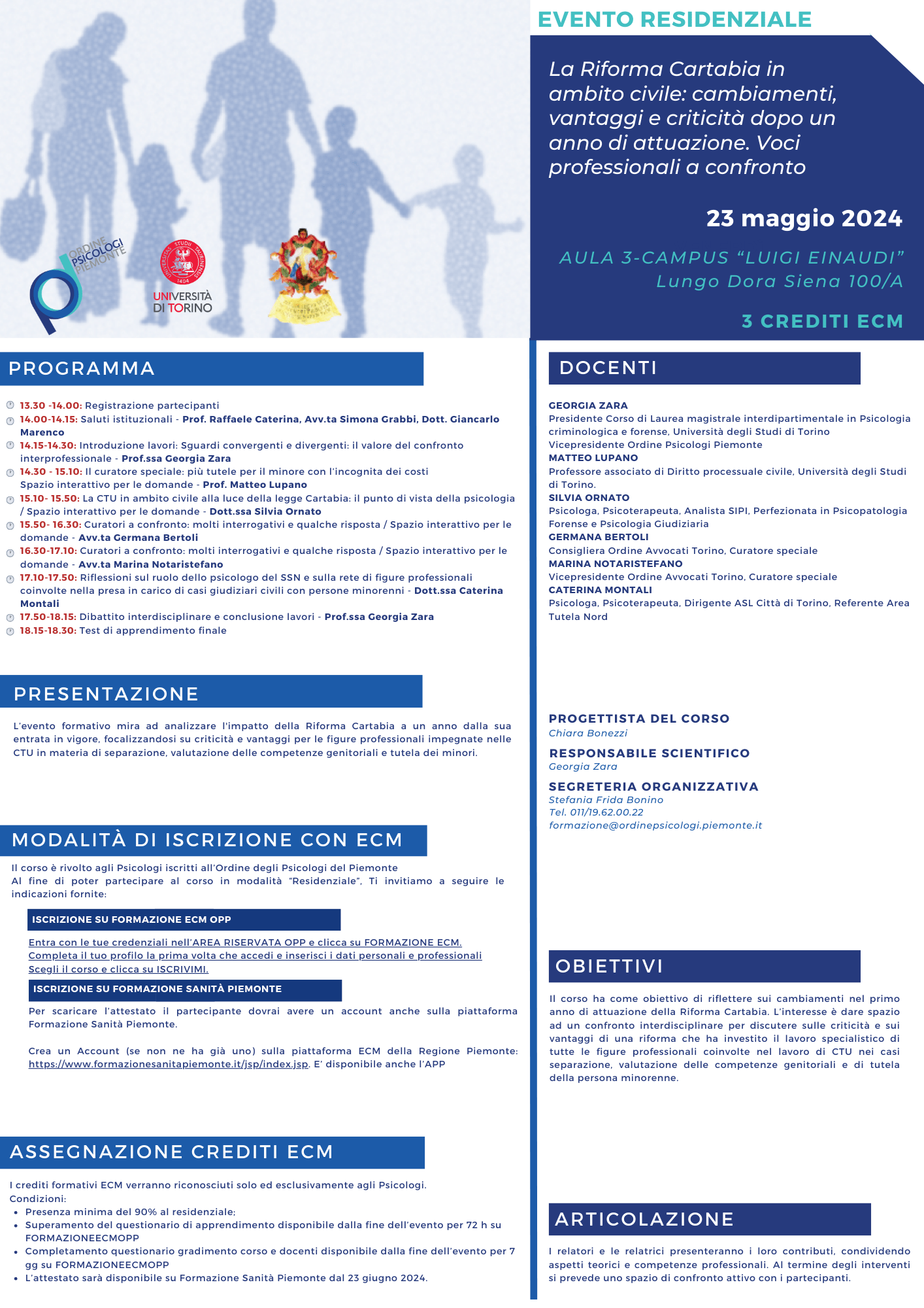 l’offerta formativa ECM in forma gratuita proposta dall’OPP alle Colleghe e ai Colleghi iscritti all’Albo con l’obiettivo di consentire di assolvere pienamente gli obblighi formativi previsti per legge, continua con l’evento dal titolo “La Riforma Cartabia in ambito civile: cambiamenti, vantaggi e criticità dopo un anno di attuazione. Voci professionali a confronto”.