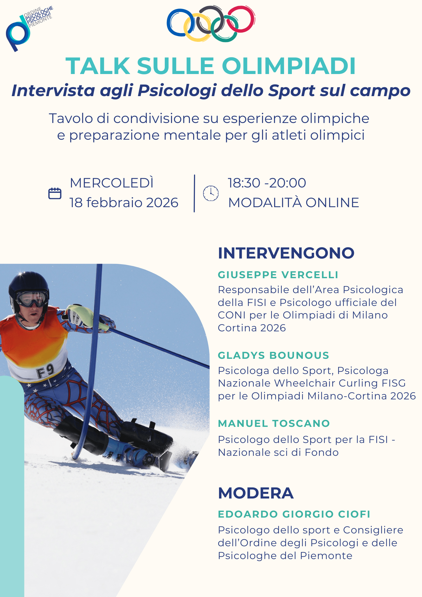 Ti invitiamo a partecipare all’iniziativa “Talk sulle Olimpiadi. Intervista agli Psicologi dello Sport sul campo. Tavolo di condivisione su esperienze olimpiche e preparazione mentale per gli atleti olimpici”, che si terrà il 18 febbraio 2026, dalle 18.30 alle 20.00, in modalità online.