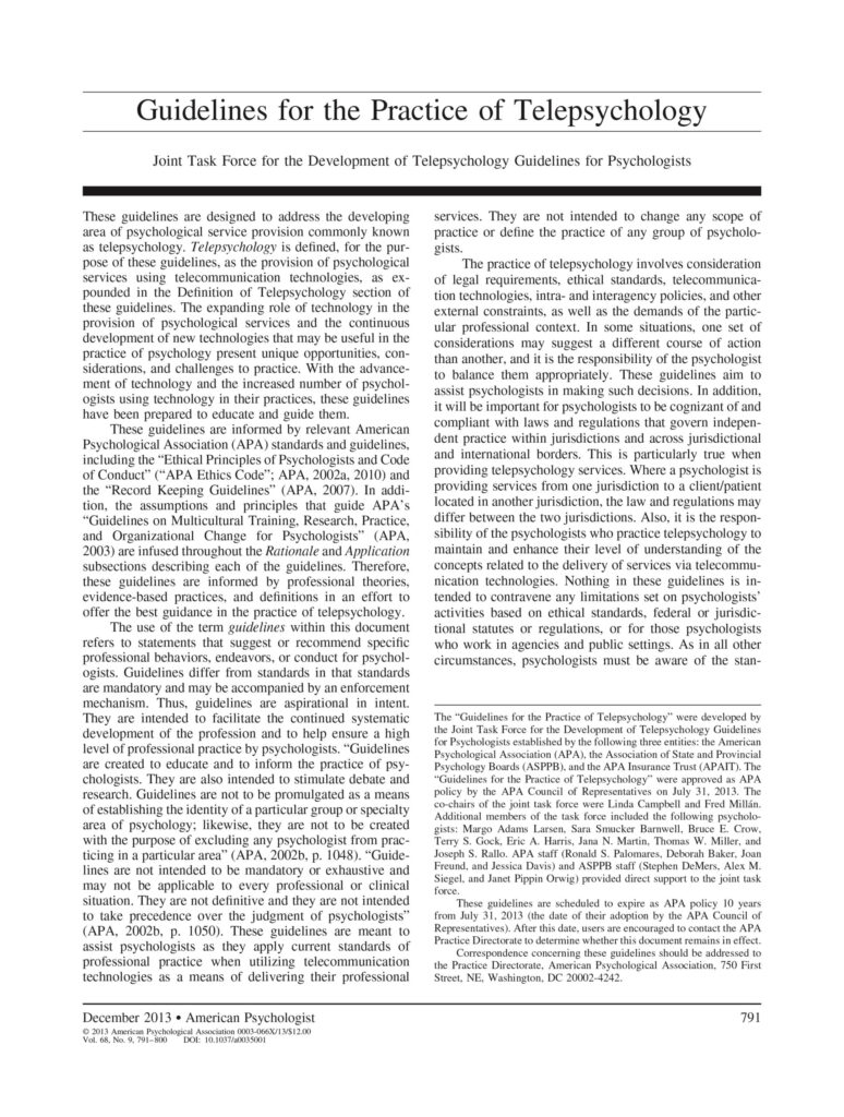 American Psychological Association (Joint Task Force for the Development of Telepsychology Guidelines for Psychologists) (2013)
