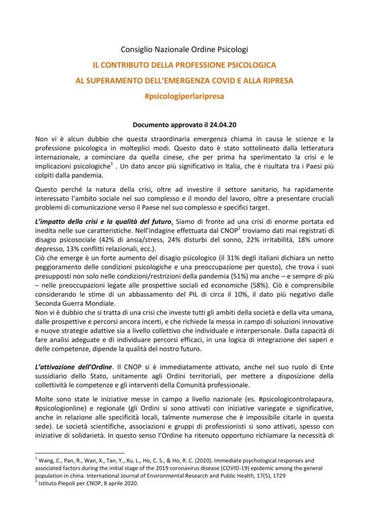 Consiglio Nazionale Ordine Psicologi, Istituto nazionale Assicurazione Infortuni sul Lavoro (2020)