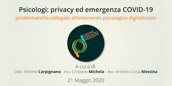 Webinar realizzato dall’Ordine degli Psicologi del Piemonte, nell’ambito del ciclo “Psicologia e COVID-19: pensiero, prassi e resilienza”. Relatori: Avv. Cristiano Michela – Avv. Antonio Ciccia Messina. Moderatore: Dott. Simone Carpignano – Ordine degli Psicologi del Piemonte