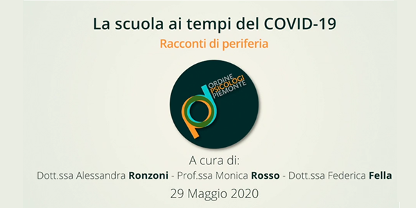 Webinar realizzato dall’Ordine degli Psicologi del Piemonte, nell’ambito del ciclo “Psicologia e COVID-19: pensiero, prassi e resilienza”. Relatrici: Dott.ssa Federica Fella – Psicologa, Psicoterapeuta, Responsabile dello Sportello d’Ascolto Scolastico, Istituto Comprensivo “A. Cairoli”, Torino – Prof.ssa Monica Rosso – Dirigente Scolastico, Istituto Comprensivo “A. Cairoli”, Torino. Moderatrice: Dott.ssa Alessandra Ronzoni – Ordine degli Psicologi del Piemonte