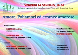 Siamo lieti di invitarLa alla conferenza dal titolo Amore, poliamori ed erranze amorose che si terrà venerdì 24 Gennaio alle ore 18.30 al Circolo dei Lettori, Via Bogino 9 – Torino.