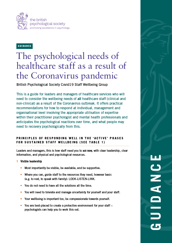 British Psychological Society Covid19 Staff Wellbeing Group (2020). The Psychological Needs of Healthcare Staff as a Result of the Coronavirus Pandemic. Leicester: The British Psychological Society.